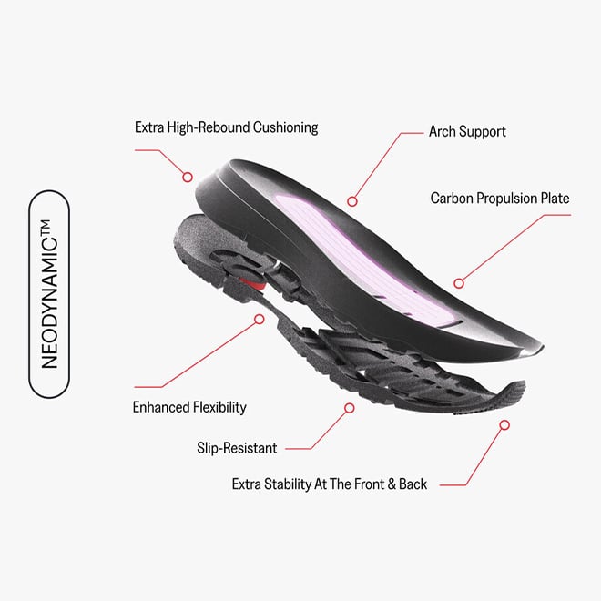 This Vitamin, a sleek superlight sports trainer, will help you move more and feel great. Biomechanically engineered for exercise and casual running, but equally good for upping your everyday activity from speedwalking to work or cycling round town. A stretchy, breathable, pull-on knit upper gives extra support at the sides and arch. On our new Neodynamic midsole: light high-rebound cushioning with a springy central carbon plate that propels you forward and smooths out movement. Flexible yet stable, superbly supportive. These are movement-motivating magic.