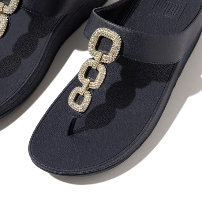 Women Midnight Navy Crystal-Chain Leather Toe-Post Sandals