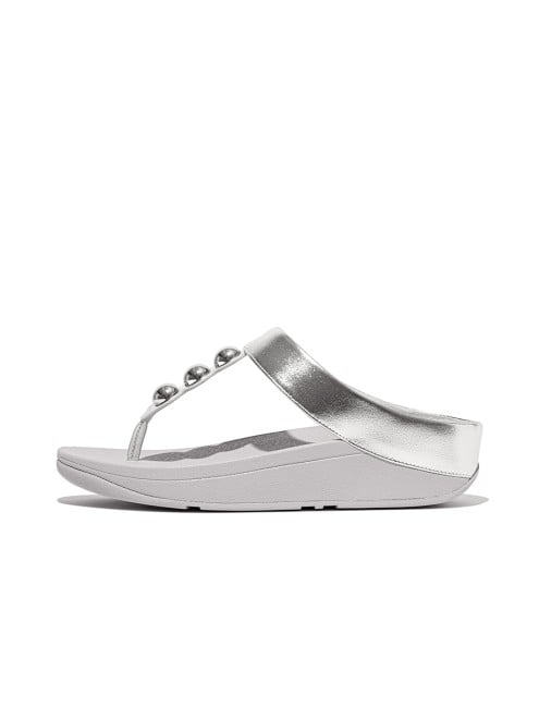 Comfortable can be seriously covetable. Case in point: the Fino, our slinky, foot-flattering toe-post sandals. On our ultra-cushioned, pressure-diffusing Microwobbleboard midsoles for unbeatable all-day comfort. Here in shimmering metallic leather. This version features a trio of chunky resin stones, set in shiny metal cases, contrasted with delicate metallic circles. Brilliant day to evening, they're jewellery for your feet.