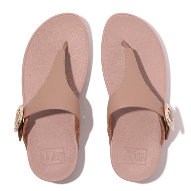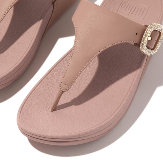 Women Beige Buff Crystal-Buckle Leather Toe-Post Sandals
